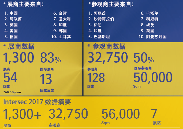 2019年的Intersec有來自60多個(gè)國家的1354家參展商參展,85%為國際展商,其中中國參展商有243家,中國勞保展商約50家。吸引了來自129個(gè)國家的32750名觀眾。