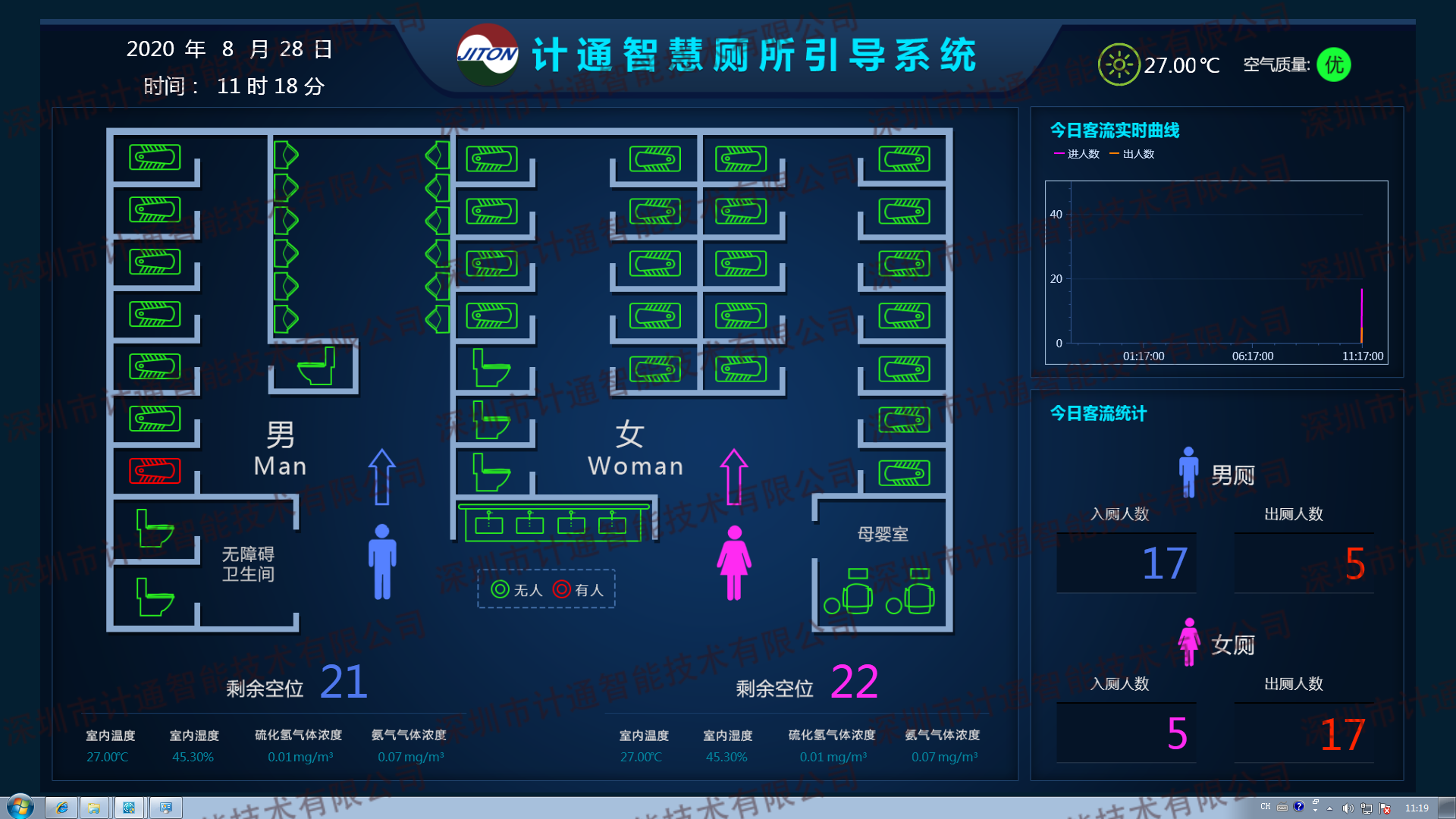 3、蹲位監(jiān)測(cè):動(dòng)態(tài)監(jiān)測(cè)廁位占用情況,可通過(guò)指示燈/屏實(shí)時(shí)顯示。