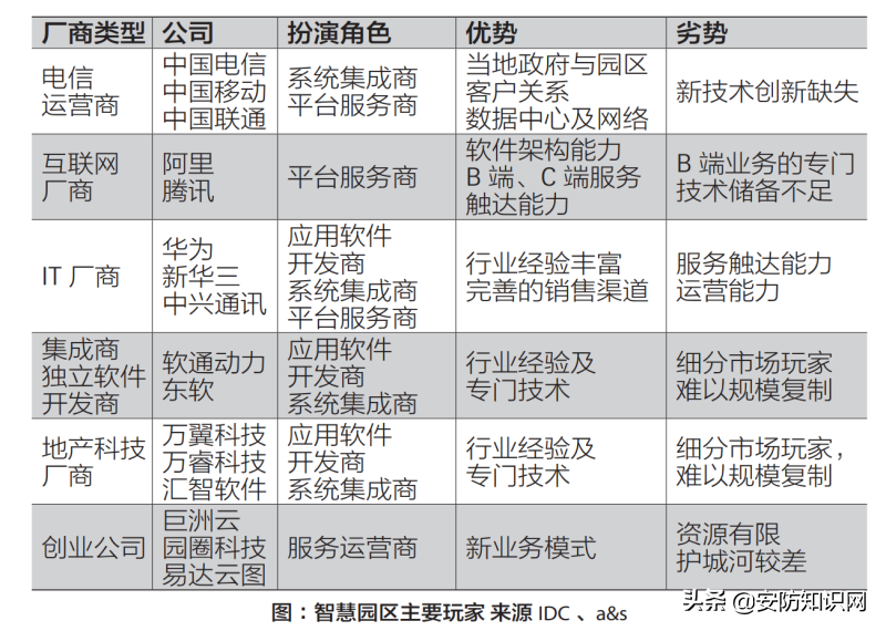 目前智慧園區(qū)的玩家類型較多,可分為電信運(yùn)營(yíng)商、互聯(lián)網(wǎng)廠商、IT 廠商、集成商、地產(chǎn)科技廠商、創(chuàng)業(yè)公司等六種類型,大部分年輕的創(chuàng)業(yè)公司均集中在運(yùn)營(yíng)管理服務(wù)領(lǐng)域,這也意味在該領(lǐng)域目前競(jìng)爭(zhēng)激烈并缺乏領(lǐng)軍企業(yè),未來具有較大的成長(zhǎng)空間,因此在這領(lǐng)域可能會(huì)迎來大量的企業(yè)進(jìn)軍。對(duì)于這批年輕的企業(yè)而言,積極引進(jìn)資本,匯聚信息資源將成為新常態(tài),以此應(yīng)對(duì)市場(chǎng)激烈競(jìng)爭(zhēng)。在基礎(chǔ)硬件及集成領(lǐng)域,情況則相反,大部分廠商均為某細(xì)分領(lǐng)域的佼佼者,如安防龍頭企業(yè)??低暤?,后發(fā)者想與他們競(jìng)爭(zhēng)難度較大,同時(shí)各家在業(yè)務(wù)的開展更多是以相輔相成為主,相比服務(wù)運(yùn)營(yíng)領(lǐng)域,這部分的市場(chǎng)競(jìng)爭(zhēng)較為緩和。