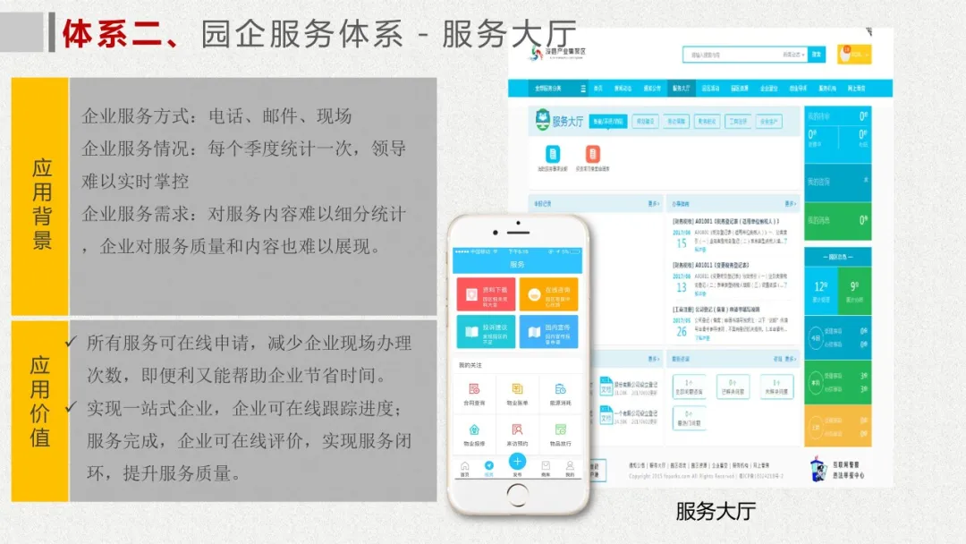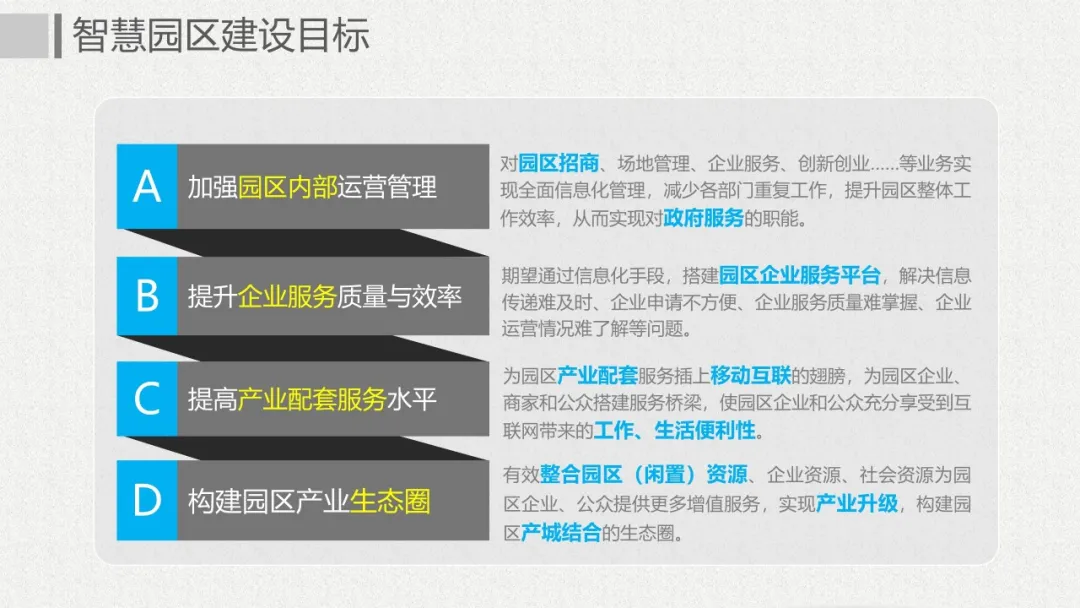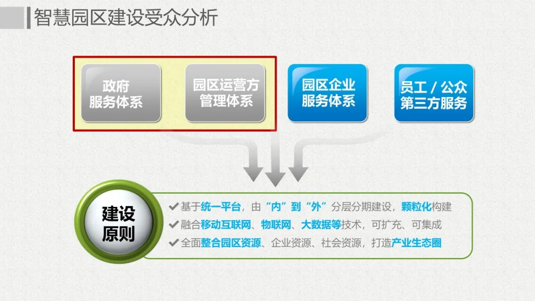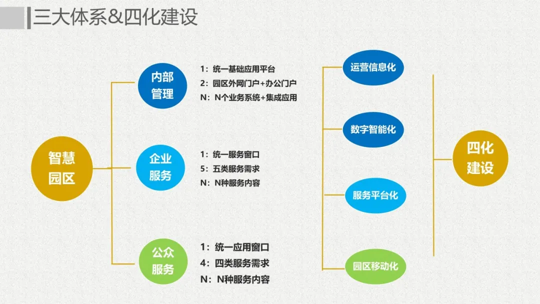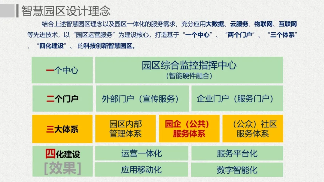 智慧園區(qū)理念以及園區(qū)一體化的服務(wù)需求,充分應(yīng)用大數(shù)據(jù)、云服務(wù)、物聯(lián)網(wǎng)、互聯(lián)網(wǎng)等先進技術(shù),以“園區(qū)運營服務(wù)”為建設(shè)核心,打造基于“一個中心”、“兩個門戶”、“三個體系”、“四化建設(shè)”的科技創(chuàng)新智慧園區(qū)。