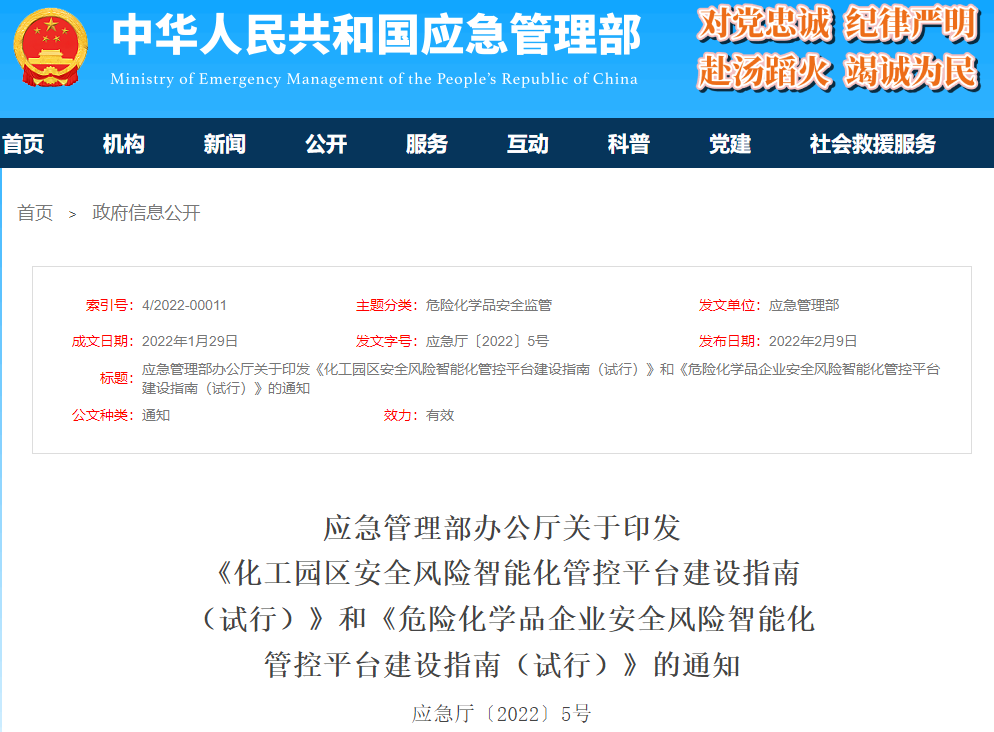 應(yīng)急管理部印發(fā)《化工園區(qū)安全風(fēng)險(xiǎn)智能化管控平臺建設(shè)指南(試行)》和《危險(xiǎn)化學(xué)品企業(yè)安全風(fēng)險(xiǎn)智能化管控平臺建設(shè)指南(試行)》,以指導(dǎo)化工園區(qū)和危險(xiǎn)化學(xué)品企業(yè)建平臺、用平臺,運(yùn)用信息數(shù)字等先進(jìn)技術(shù)手段強(qiáng)化安全風(fēng)險(xiǎn)防控能力,推動(dòng)化工園區(qū)、危險(xiǎn)化學(xué)品安全風(fēng)險(xiǎn)管控?cái)?shù)字化轉(zhuǎn)型、智能化升級。