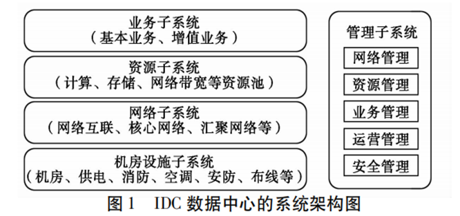 · 管理子系統(tǒng)負(fù)責(zé)對數(shù)據(jù)中心的基礎(chǔ)設(shè)施、網(wǎng)絡(luò)、計算機(jī)資源進(jìn)行資源管理、系統(tǒng)運(yùn)行管理,安全管理,并和客戶合作進(jìn)行數(shù)據(jù)中心承載的各種業(yè)務(wù)運(yùn)營管理。