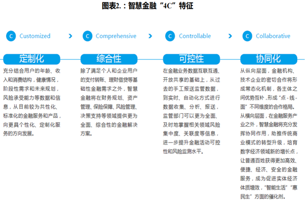 智慧金融的特征主要體現(xiàn)在定制化、綜合性、可控性與協(xié)同化四個方面: