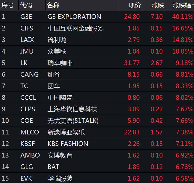 熱門(mén)中概股多數(shù)收漲,阿里巴巴跌0.11%,京東漲1.74%,百度漲3.58%;流利說(shuō)漲14.81%,瑞幸咖啡漲9.18%,無(wú)憂英語(yǔ)漲7.66%,微博漲1.47%,拼多多漲2.09%,蔚來(lái)汽車(chē)漲0.66%。青客跌15.04%,品鈦(PT.O)跌11.25%。