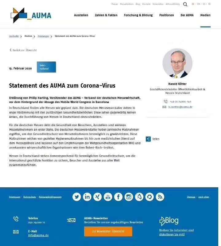 AUMA-德國展覽業(yè)協(xié)會,也同樣與聯(lián)邦外交部、聯(lián)邦經(jīng)濟(jì)與技術(shù)部和聯(lián)邦衛(wèi)生部保持頻繁聯(lián)絡(luò)。