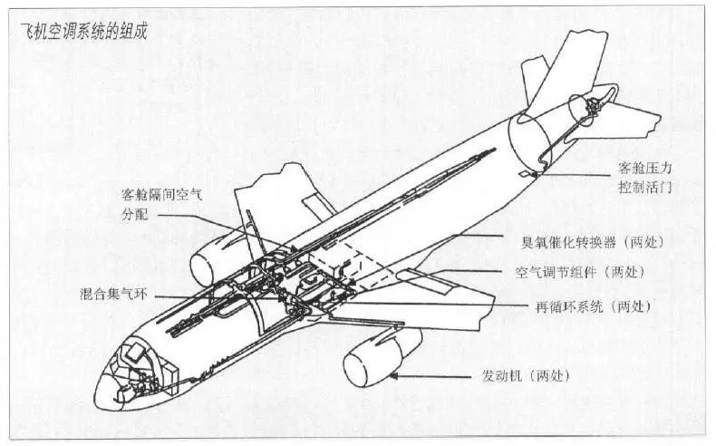 現(xiàn)代飛機(jī)的客艙空氣調(diào)節(jié)系統(tǒng)包括引氣系統(tǒng)、臭氧轉(zhuǎn)換器、空氣調(diào)節(jié)組件、混合集氣環(huán)、再循環(huán)系統(tǒng)、客艙通風(fēng)系統(tǒng)以及客艙壓力控制系統(tǒng)。