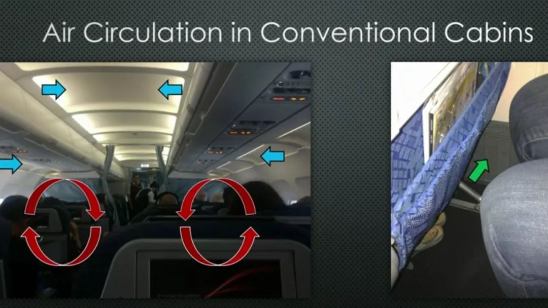 研究表明, 機(jī)艙中的空氣由機(jī)艙的頂部和側(cè)邊進(jìn)入(藍(lán)色箭頭),然后經(jīng)過高效的過濾器離開機(jī)艙(綠色箭頭),有99.97%的病菌會被過濾掉。