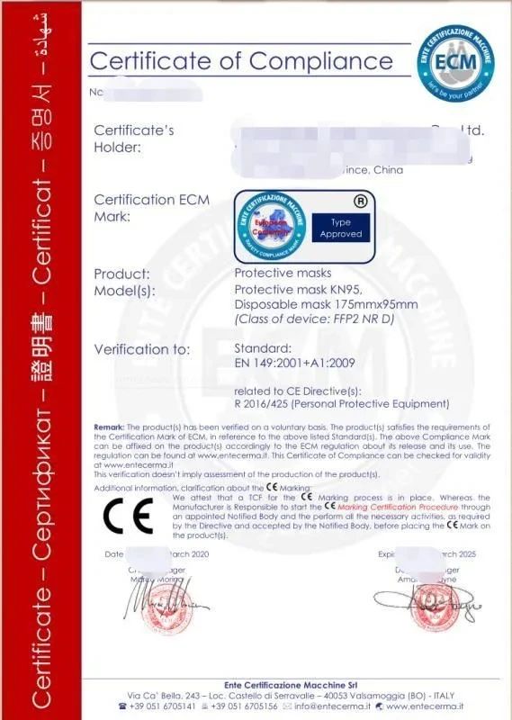 意大利認(rèn)證公告機(jī)構(gòu) ENTE CERTIFICAZIONE MACCHINE SRL,公告號(hào)1282該機(jī)構(gòu)沒(méi)有PPE法規(guī) (EU) 2016/425授權(quán),因此無(wú)權(quán)簽發(fā)防護(hù)口罩CE證書(shū),該證書(shū)不符合歐盟法律規(guī)定!