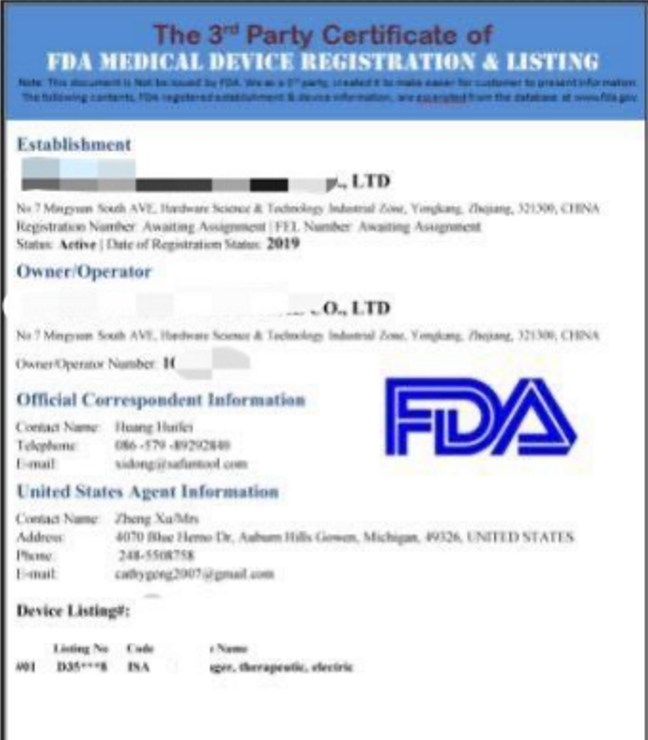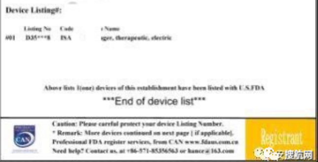 實際上,F(xiàn)DA注冊是沒有證書的,產品通過在FDA進行注冊,將取得注冊號碼,F(xiàn)DA會給申請人一份回函(有FDA行政長官的簽字),但不存在FDA證書一說。我們通??吹降倪@個證書是中介代理機構(注冊代理)簽發(fā)給廠家,以證明其幫助該廠家完成了美國FDA要求的“生產設施注冊和產品類型注冊”,完成的標志是幫助廠家取得了FDA的注冊登記號。