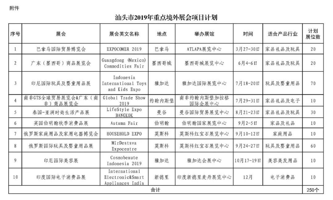 據(jù)了解,根據(jù)汕頭市2019年重點(diǎn)境外展會(huì)項(xiàng)目計(jì)劃,10個(gè)展會(huì)項(xiàng)目分別為巴拿馬國際貿(mào)易博覽會(huì)、廣東(墨西哥)商品展覽會(huì)、印尼國際玩具及嬰童用品展、南非GTS全球貿(mào)易展覽會(huì)&廣東(南非)商品展覽會(huì)、泰國-亞洲時(shí)尚生活產(chǎn)品展、英國伯明翰秋季消費(fèi)品展、俄羅斯家庭用品及家用電器博覽會(huì)、俄羅斯國際玩具及嬰童用品展、印尼國際美容展、印度國際電子消費(fèi)品展,適用產(chǎn)品涵蓋家品禮品、玩具、電子、美容美發(fā)等多個(gè)行業(yè),汕頭市計(jì)劃安排展位數(shù)共計(jì)250個(gè)。
