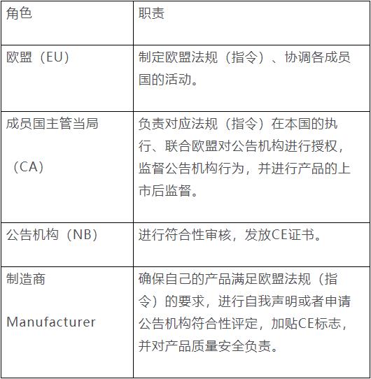 產(chǎn)品經(jīng)公告機(jī)構(gòu)符合性評(píng)定后加貼CE標(biāo)志的流程:產(chǎn)品制造商向公告機(jī)構(gòu)提出申請(qǐng),公告機(jī)構(gòu)為制造商提供符合性評(píng)定服務(wù),制造商及產(chǎn)品符合法規(guī)要求的,向制造商發(fā)放CE證書。制造商依據(jù)CE證書簽署符合性聲明,產(chǎn)品加貼CE標(biāo)志后就可以進(jìn)入歐盟市場。下表列舉了歐盟、成員國的主管當(dāng)局、公告機(jī)構(gòu)和制造商的職責(zé)。