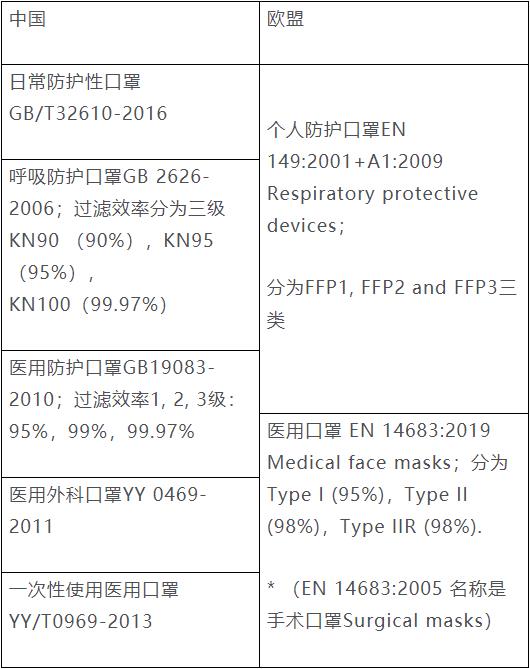 我國通常將口罩分為民用口罩和醫(yī)用口罩。為便于理解,特將中國口罩類型及標(biāo)準(zhǔn)和歐盟的口罩類型及適用標(biāo)準(zhǔn)相對(duì)應(yīng),幫助大家了解您的口罩可能對(duì)應(yīng)的是那種歐盟口罩,以及需要滿足那個(gè)標(biāo)準(zhǔn)的要求。需要說明的是這種對(duì)應(yīng)并不是嚴(yán)格的對(duì)應(yīng),并且中歐標(biāo)準(zhǔn)要求也有差異,請(qǐng)大家自己根據(jù)標(biāo)準(zhǔn)的詳細(xì)要求分析并判定。