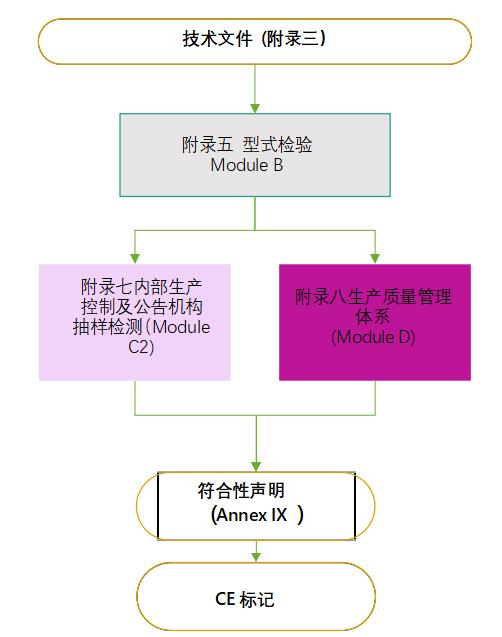 按照PPE法規(guī)要求,個(gè)人防護(hù)口罩需要有公告機(jī)構(gòu)審核發(fā)放的CE證書,才能在歐盟合法上市銷售。根據(jù)PPE法規(guī)關(guān)于符合性的相關(guān)規(guī)定,制造商需要建立相應(yīng)技術(shù)文件,并滿足EN149:2001+A1:2009的規(guī)格和測試要求。和醫(yī)用口罩相比,個(gè)人防護(hù)口罩至少需獲得兩張公告機(jī)構(gòu)的證書,即按照附錄五的型式檢驗(yàn)證書,按照附錄七(Module C2)的證書或者附錄八(Module D)的證書,詳見下圖: