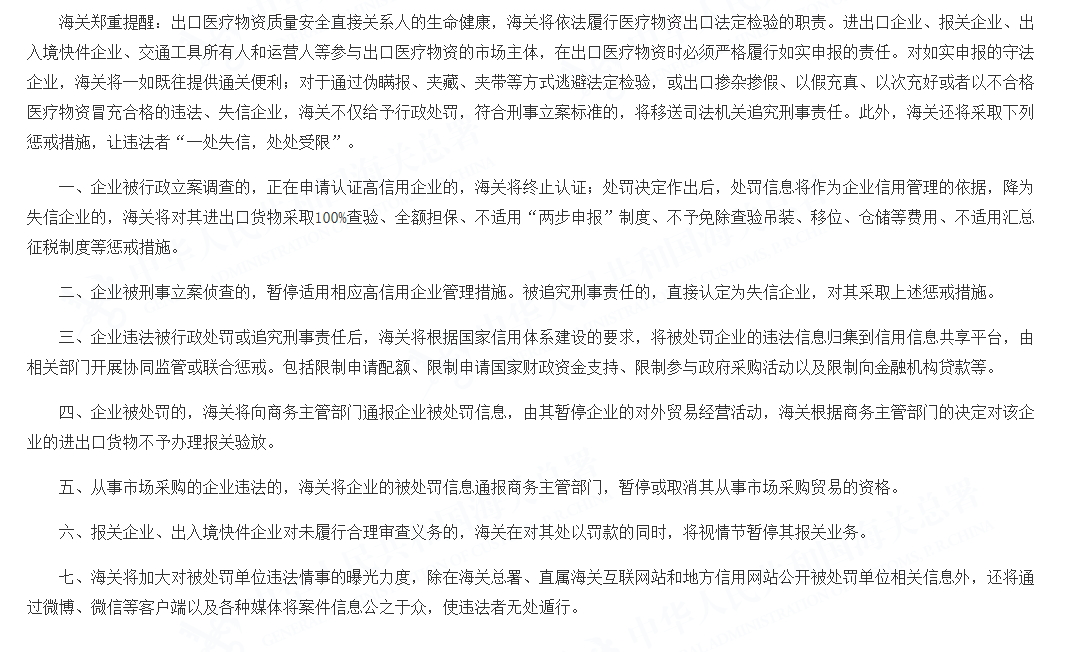 海關(guān)總署有關(guān)負(fù)責(zé)人表示,對如實申報的守法企業(yè),海關(guān)將一如既往提供通關(guān)便利;對于通過偽瞞報、夾藏、夾帶等方式逃避法定檢驗,或出口摻雜摻假、以假充真、以次充好或者以不合格醫(yī)療物資冒充合格的違法、失信企業(yè),海關(guān)不僅給予行政處罰,符合刑事立案標(biāo)準(zhǔn)的,將移送司法機(jī)關(guān)追究刑事責(zé)任。此外,海關(guān)還將加大對被處罰單位違法行為的曝光力度,使違法者無處遁形。