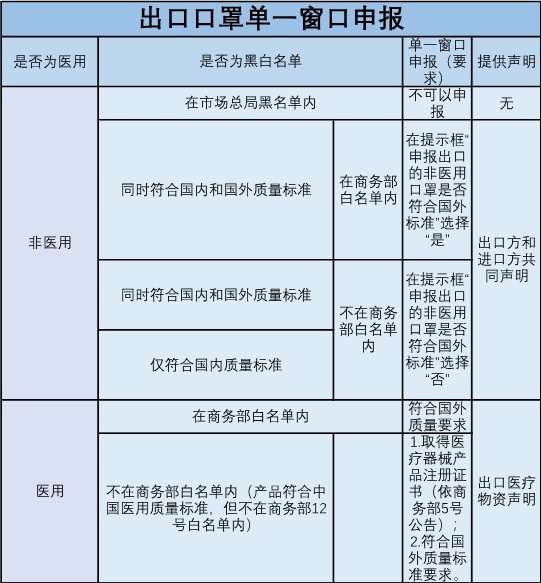 1.非醫(yī)用口罩出口實(shí)行白黑名單管理,商務(wù)部提供白名單,市場監(jiān)管總局提供黑名單。符合國外質(zhì)量標(biāo)準(zhǔn)看商務(wù)部白名單(需在名單內(nèi));國內(nèi)質(zhì)量標(biāo)準(zhǔn)看市場監(jiān)管總局黑名單(需不在名單內(nèi))。