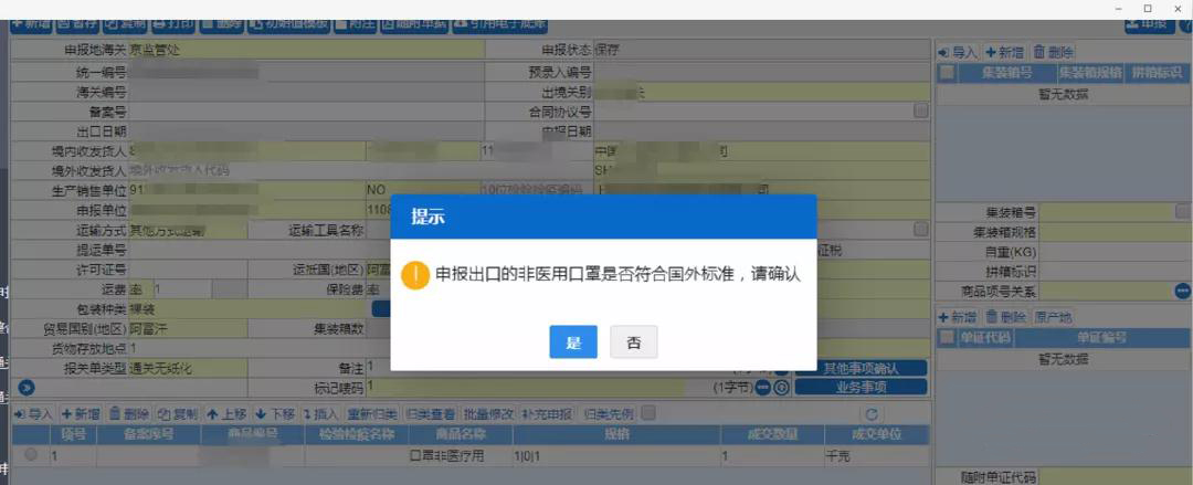 2.目前,單一窗口系統(tǒng)已更新,填報(bào)時,在出口報(bào)關(guān)單的“生產(chǎn)銷售單位”欄目填寫實(shí)際生產(chǎn)口罩企業(yè)名稱及代碼(不填銷售企業(yè)),并點(diǎn)擊是否符合國外標(biāo)準(zhǔn),此時,單一窗口系統(tǒng)會將申報(bào)的生產(chǎn)企業(yè)名單與商務(wù)部提供的白名單進(jìn)行核碰,核碰上的,則自動受理申報(bào)。