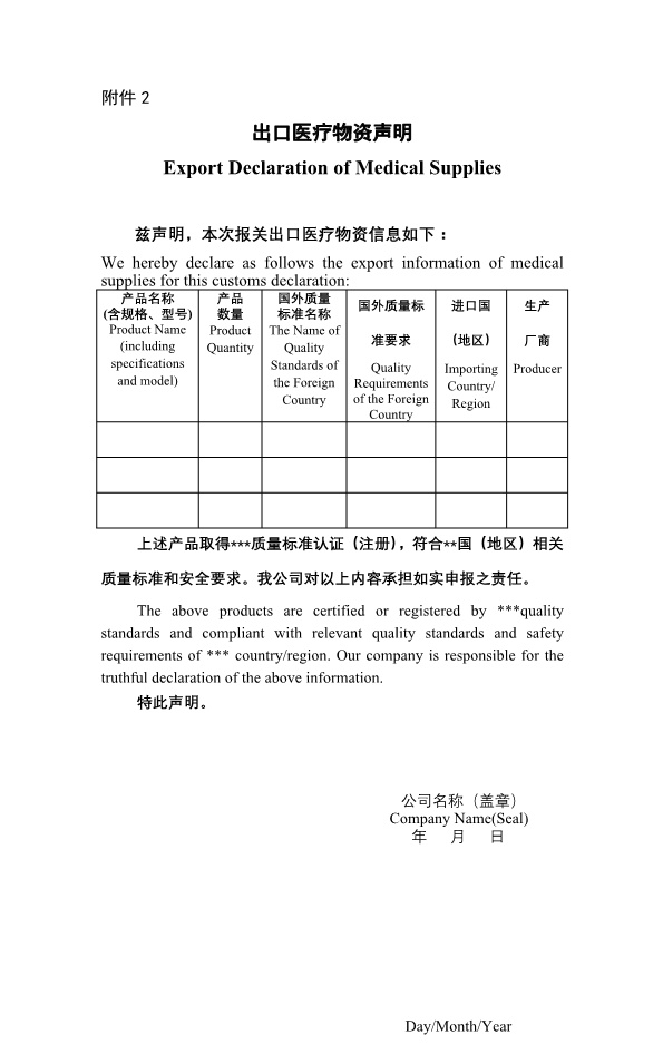 不在商務(wù)部12號公告白名單內(nèi)但產(chǎn)品符合中國醫(yī)用質(zhì)量標(biāo)準(zhǔn)的,按照商務(wù)部5號公告執(zhí)行,企業(yè)需取得醫(yī)療器械產(chǎn)品注冊證書,并提供出口醫(yī)療物資聲明承諾符合國外質(zhì)量標(biāo)準(zhǔn)要求。