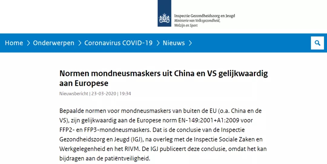 https://www.igj.nl/onderwerpen/coronavirus/nieuws/2020/03/23/mondmaskers-uit-china-en-vs-gelijkwaardig-aan-europese(可直接點擊鏈接登錄)