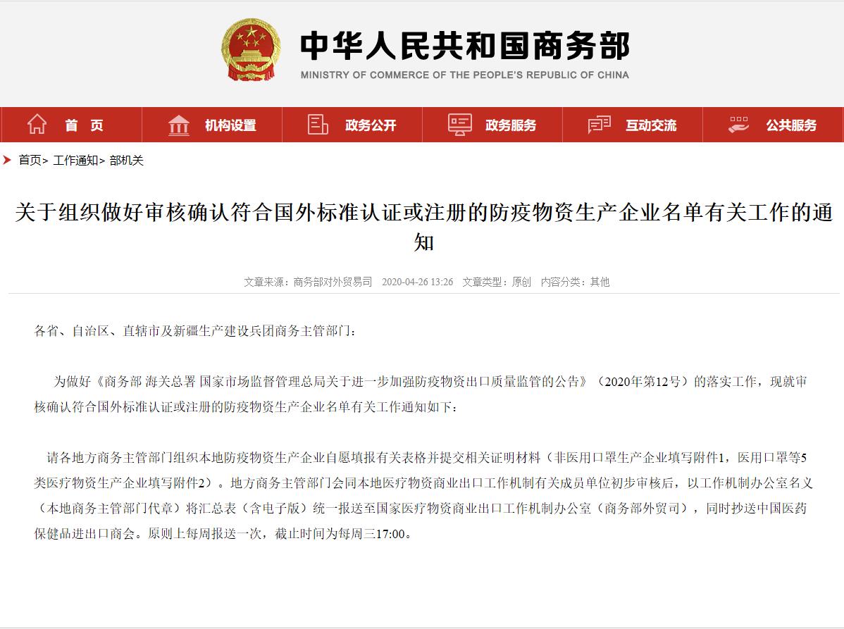 4月26日,商務(wù)部發(fā)布通知,防疫物資生產(chǎn)企業(yè)可以向本地商務(wù)局申請加入商務(wù)部白名單,并提交相關(guān)表格和證明材料。