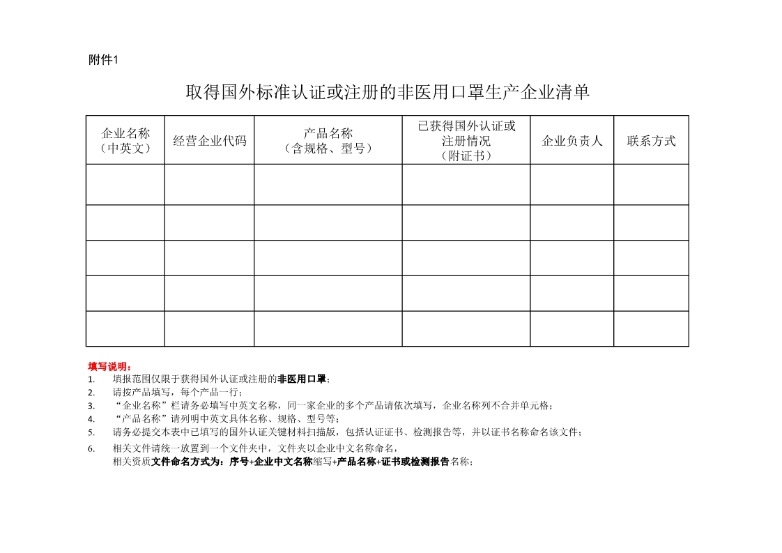 請各地方商務(wù)主管部門組織本地防疫物資生產(chǎn)企業(yè)自愿填報有關(guān)表格并提交相關(guān)證明材料(非醫(yī)用口罩生產(chǎn)企業(yè)填寫附件1,醫(yī)用口罩等5類醫(yī)療物資生產(chǎn)企業(yè)填寫附件2)。
