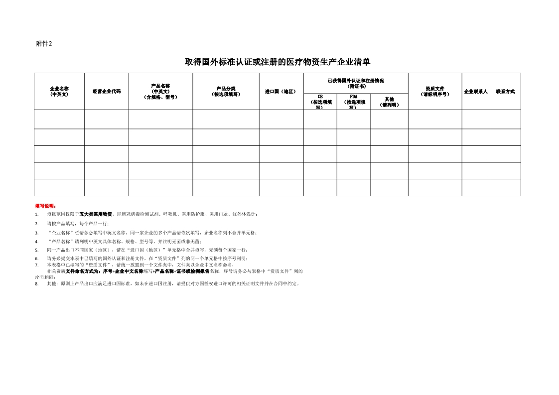 6.請務(wù)必提交本表中已填寫的國外認(rèn)證和注冊文件,在“資質(zhì)文件”列的同一個單元格中按序號列明;
