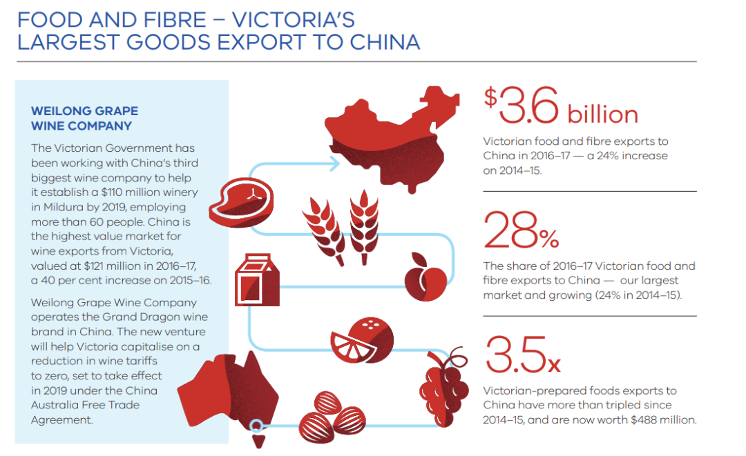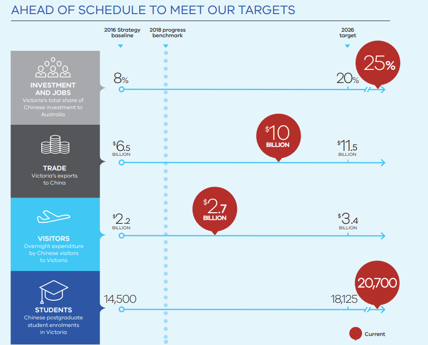 一份來自維州政府2018年的對華關(guān)系政策文件就指出,中國是該州最大的貿(mào)易伙伴和該州最大的產(chǎn)品出口國,也是最大的游客和國際留學生來源國。這份文件還預測,若雙邊的關(guān)系可以維持這種良好的增長勢頭,那么在2026年時維州對中國的出口貿(mào)易額、經(jīng)濟發(fā)展和就業(yè)等數(shù)據(jù)都將出現(xiàn)更大幅的增長,甚至翻倍。