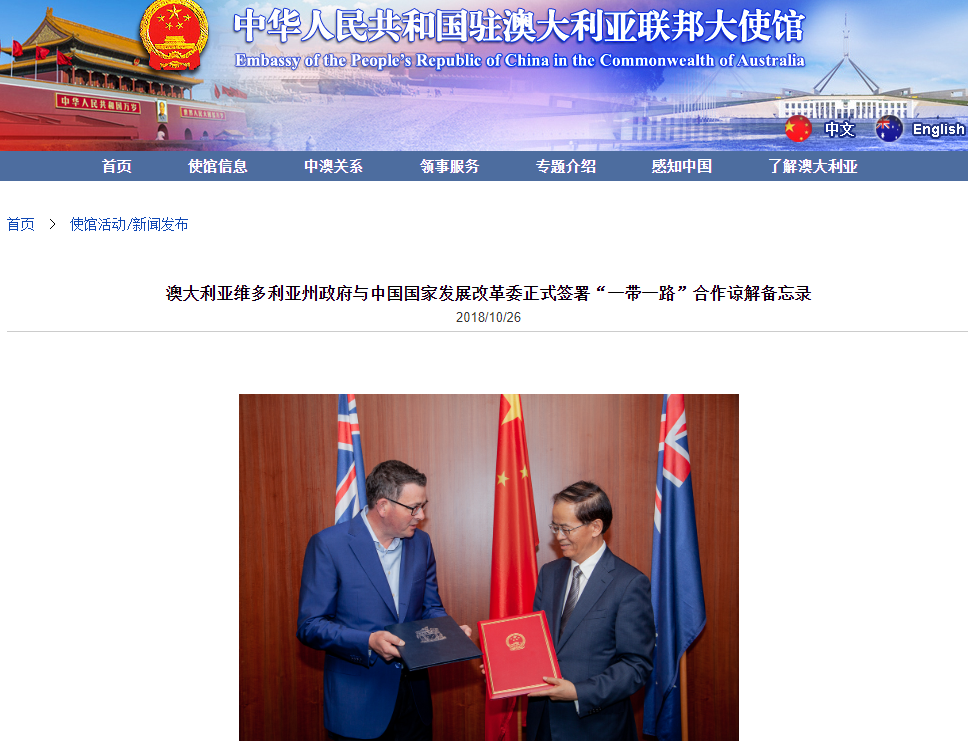 (截圖來自2018年維州政府發(fā)布的一份涉華政策文件,內(nèi)容分別涉及雙方的經(jīng)貿(mào)關(guān)系,游客數(shù)據(jù),以及雙邊關(guān)系若保持良好的增長勢頭,會在2026年給維州經(jīng)濟帶來的發(fā)展趨勢)于是,在這種頗為務(wù)實的對華政策指引下,該州于2018年于中方簽訂了“一帶一路”合作諒解備忘錄。這是一份沒有法律約束力的合作意向性文件,而且從維州政府公開的這個合作諒解備忘錄的內(nèi)容來看,內(nèi)容也都是發(fā)展經(jīng)貿(mào)合作,令雙方互利互惠的內(nèi)容,其中沒有任何額外的政治條件,更沒有任何會侵害澳大利亞利益的內(nèi)容。