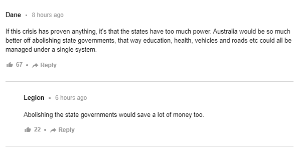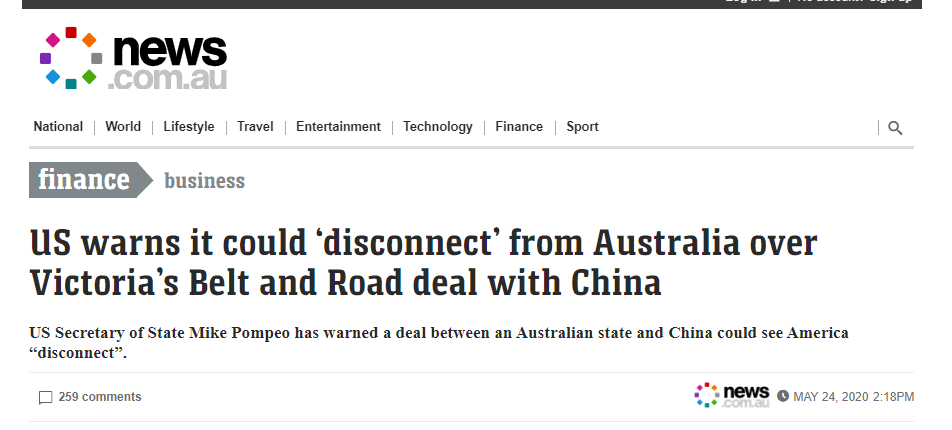 默多克旗下的另一家澳大利亞新聞媒體News.com.au就在報道蓬佩奧的威脅時,反過來將維州政府“數(shù)落”了一番,并瘋狂炒作中國的一帶一路是債務(wù)陷阱,很可怕。而在其評論板塊里,一些獲得高點贊的評論甚至表示澳大利亞應該廢除聯(lián)邦制,以阻止維州與中國的合作。