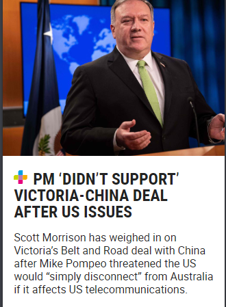如今,隨著維州與中方在“一帶一路”合作上的推進,雙方在合作的具體事宜上已經(jīng)進入了談判的最終階段。于是,為了阻止此事的發(fā)生,親特朗普當局的西方媒體大亨默多克旗下的天空新聞網(wǎng)澳洲版,便在采訪美國國務(wù)卿蓬佩奧的時候,專門提出了維州將和中國簽訂“一帶一路”合作協(xié)議的事情,好讓蓬佩奧對澳大利亞聯(lián)邦政府和維多利亞州施壓。蓬佩奧便由此說出了,如果這個合作涉及電信和5G方面的合作,危及澳大利亞的“電信安全”,美國就會與澳大利亞的“切斷聯(lián)系”。