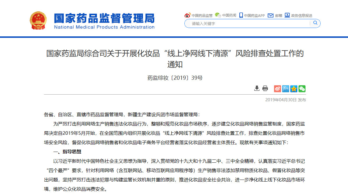 4月30日,國(guó)家藥監(jiān)局發(fā)布《關(guān)于開展化妝品“線上凈網(wǎng)線下清源”風(fēng)險(xiǎn)排查處置工作的通知(藥監(jiān)綜妝〔2019〕39號(hào) )》。通知指出,國(guó)家藥監(jiān)局決定自5月起,在全國(guó)范圍內(nèi)開展化妝品“線上凈網(wǎng)線下清源”風(fēng)險(xiǎn)排查處置工作,排查處置化妝品網(wǎng)絡(luò)銷售市場(chǎng)安全風(fēng)險(xiǎn)。