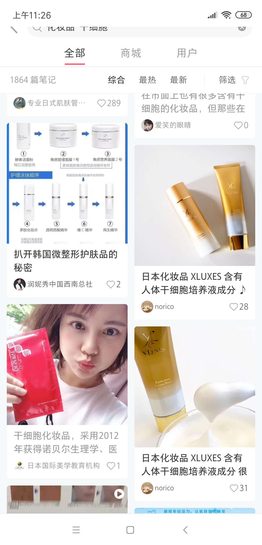 (圖為小紅書“干細(xì)胞”關(guān)鍵詞的化妝品相關(guān)筆記)