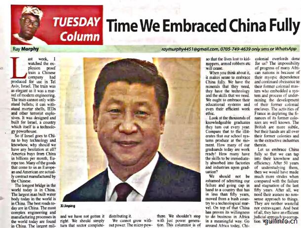 14日,尼日利亞主流媒體《領(lǐng)導(dǎo)者報(bào)》 使用整版封底刊登專欄文章“全面擁抱中國(guó)時(shí)不我待”,積極評(píng)價(jià)中國(guó)在各領(lǐng)域取得的全方位成就,呼吁尼各界主動(dòng)學(xué)習(xí)中國(guó),積極擁抱中國(guó)資金、中國(guó)技術(shù)、中國(guó)理念,以助力非洲發(fā)展。