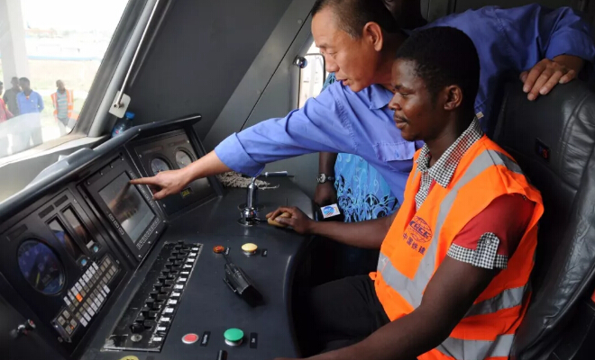 尼日利亞阿卡鐵路,中國(guó)師傅在教當(dāng)?shù)貑T工駕駛列車。
