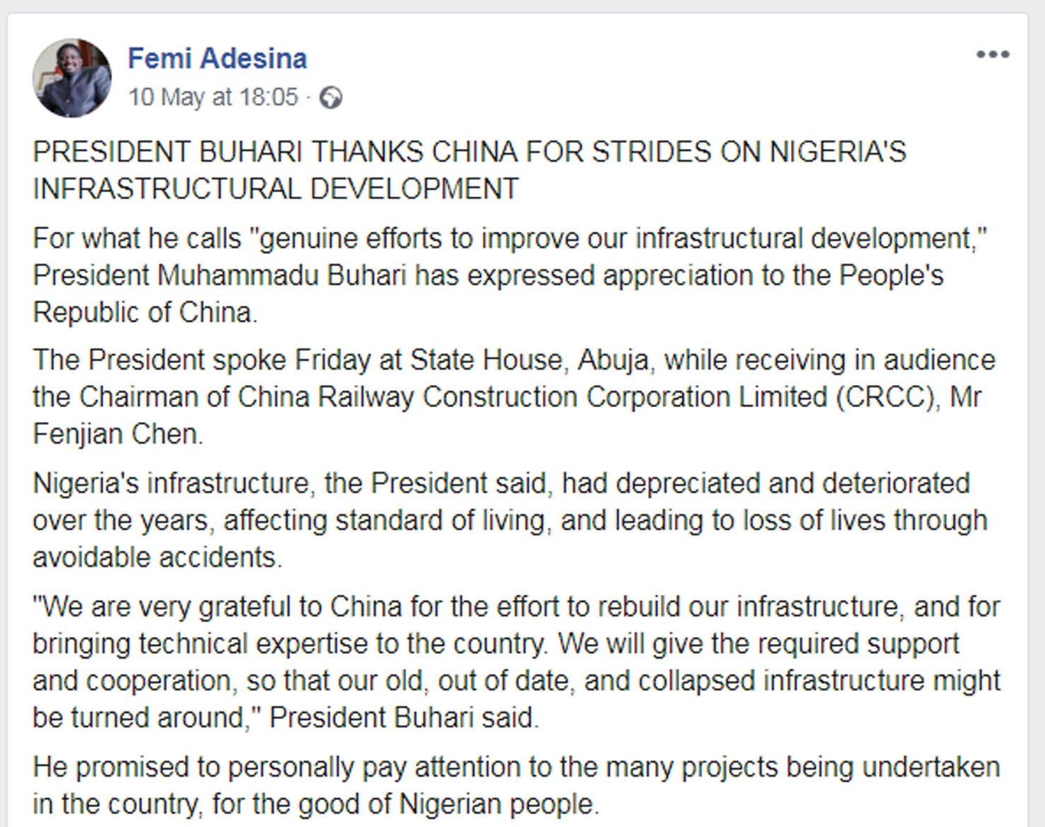 中國(guó)外交部發(fā)言人陸慷也表示:尼日利亞是非洲人口最多的發(fā)展中國(guó)家,中國(guó)是世界上最大的發(fā)展中國(guó)家,中尼合作平等互利,是兄弟般的南南合作。我們高度重視深化中尼合作關(guān)系,愿同尼方加強(qiáng)發(fā)展戰(zhàn)略對(duì)接,更好地實(shí)現(xiàn)互利共贏。