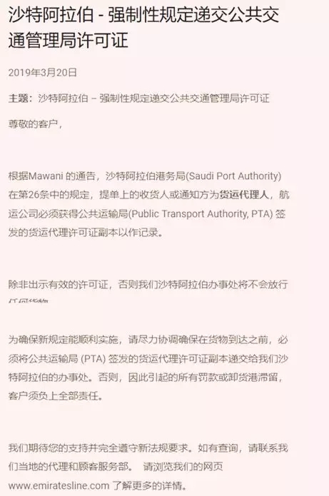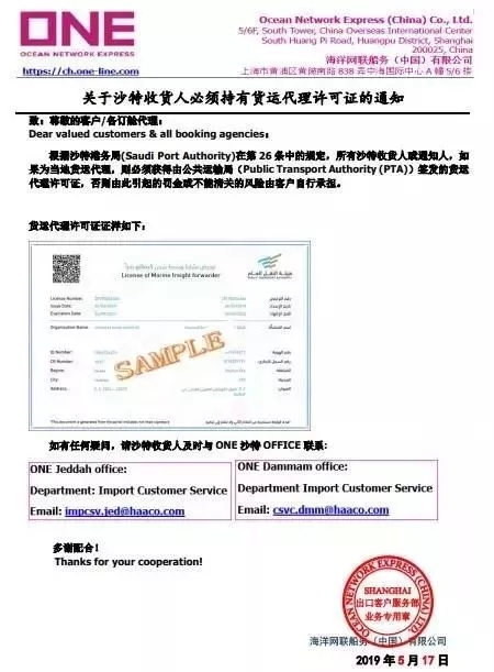 為確保新規(guī)定能順利實(shí)施,請(qǐng)盡力協(xié)調(diào)確保在貨物到達(dá)之前,必須將公共運(yùn)輸局 (PTA) 簽發(fā)的貨運(yùn)代理許可證副本遞交給我們沙特阿拉伯的辦事處。否則,因此引起的所有罰款或卸貨港滯留,客戶須負(fù)上全部責(zé)任。
