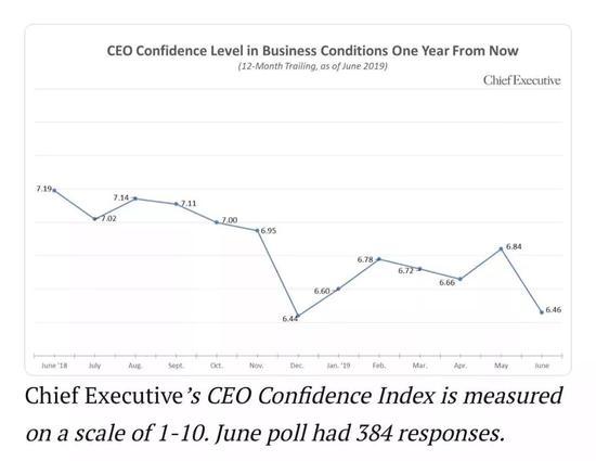 數(shù)據(jù)顯示,受到美國政府關(guān)稅和貿(mào)易政策的影響,美國企業(yè)CEO信心指數(shù)在下降,與去年同期相比,企業(yè)CEO信心下降了10%,而今年5月中美貿(mào)易磋商未果,也導(dǎo)致了6月份企業(yè)CEO信心指數(shù)猛跌。