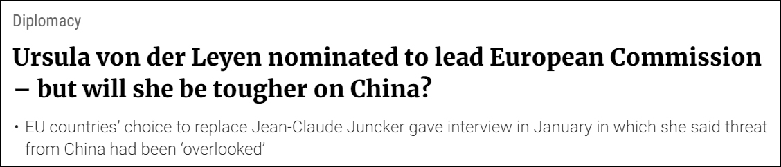 馮德萊恩被提名為歐盟委員會(huì)主席——她會(huì)對(duì)華更加強(qiáng)硬嗎? 《南華早報(bào)》馮德萊恩被提名為歐盟委員會(huì)主席——她會(huì)對(duì)華更加強(qiáng)硬嗎? 《南華早報(bào)》