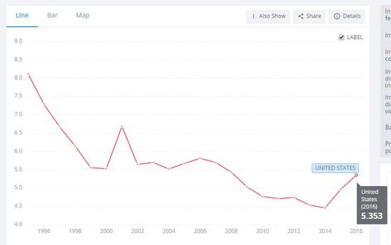 至于美國整體的命案率,主頁君在世行網(wǎng)站上找到了數(shù)據(jù):5.353人/10萬。