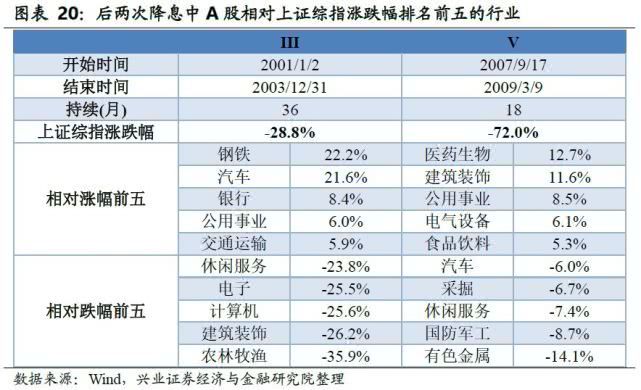 美聯(lián)儲降息均開始于美國經(jīng)濟出現(xiàn)內(nèi)憂外患之時。而此時中國也難以獨善其身,可能同樣面臨經(jīng)濟處于底部、遭受外部沖擊的局面,此時具有良好業(yè)績支撐和防御屬性的行業(yè)表現(xiàn)較好。