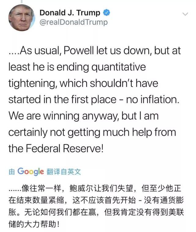 特朗普表示:“和往常一樣,鮑威爾讓我們失望了,但至少他結(jié)束了量化緊縮政策,這本來就不應(yīng)該開始——沒有通貨膨脹。我肯定不會從美聯(lián)儲得到多少幫助!”
