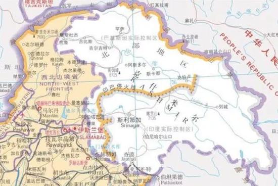 ▲圖中白色區(qū)域為克什米爾地區(qū),其中的黃色線條為印巴?;鹁€,巴基斯坦控制?;鹁€北部地區(qū)和西部少部分地區(qū),印度控制其他占整個克什米爾3/5的區(qū)域