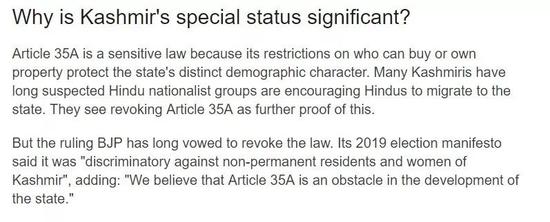 這里需要注意的是,當(dāng)年印度為了維持這個[查謨和克什米爾邦]的穩(wěn)定、安撫當(dāng)?shù)氐哪滤沽置癖姾痛_保其“效忠”印度,曾同意在印度的憲法中(第370條款)給予當(dāng)?shù)匾粋€“特殊地位”,即允許當(dāng)?shù)負(fù)碛凶约旱膽椃?、旗幟,以及除了國防、通訊和外交事?wù)外的獨立決策權(quán)。甚至為了維護當(dāng)?shù)靥厥獾娜丝诮Y(jié)構(gòu),印度隨后還同意在憲法中(第35a條款)禁止其它地方的人在當(dāng)?shù)刭徺I房產(chǎn)、定居、和成為當(dāng)?shù)氐墓珓?wù)員。當(dāng)?shù)嘏尤绻c外地人結(jié)婚,那么她和她的子女也將失去在當(dāng)?shù)負(fù)碛挟a(chǎn)權(quán)的權(quán)利。
