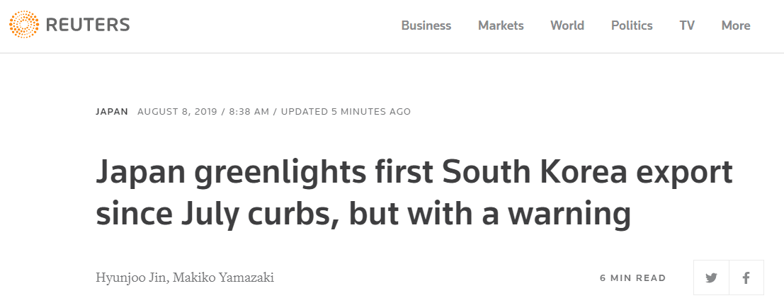 據(jù)報道,就批準(zhǔn)對韓出口一事,日本內(nèi)閣官房長官菅義偉對記者說,日本在妥善管理出口,“我們允許合法貿(mào)易”。報道稱,日本經(jīng)濟產(chǎn)業(yè)省在審查后認(rèn)定,這些材料不存在被應(yīng)用于軍事裝備的風(fēng)險。