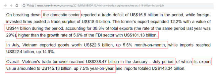 1-7月,美國為越南最大出口市場,共計出口325億美元,同比暴漲25.4%;越南對歐盟出口243.2億美元,同比增0.4%;越南對華出口200億美元,同比增0.1%。
