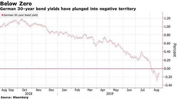 由于擔(dān)心全球經(jīng)濟疲弱以及預(yù)期歐洲央行將啟動新一輪寬松政策,投資者紛紛買入歐元區(qū)的安全資產(chǎn)德國國債。德國30年期的現(xiàn)券收益率也在近期下降到了-0.2%附近,一年前這個數(shù)值還維持在1%附近。