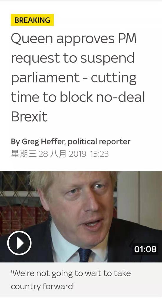 然而,此次鮑里斯請求的休會時間長達5周。據(jù)英國廣播公司(BBC)28日早些時候的報道,本來議員們將在9月3日結束休假回到議會開始新的會期。若女王同意議會休會,議員們將不得不從9月10日開始休會,直至10月14日。