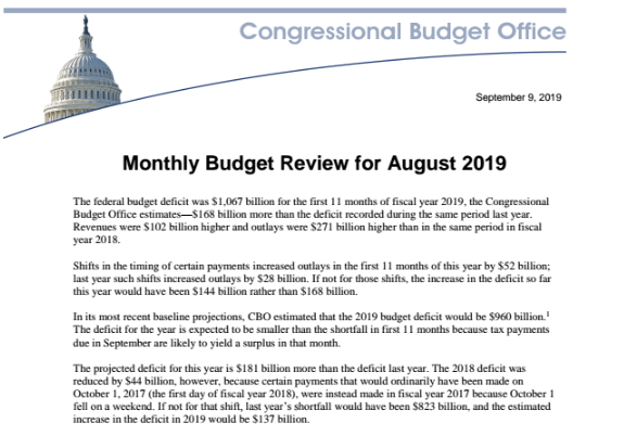 2周前,CBO曾表示,年均財(cái)政赤字將在2020財(cái)年擴(kuò)大到1萬(wàn)億美元,比之前的預(yù)期提前兩年。2019財(cái)年聯(lián)邦財(cái)政赤字為9600億美元,聯(lián)邦財(cái)政赤字占國(guó)內(nèi)生產(chǎn)總值(GDP)比例將介于4.4%和4.8%之間。沒(méi)想到2周后,2019財(cái)年前11個(gè)月的赤字?jǐn)?shù)據(jù)就超過(guò)了萬(wàn)億美元。