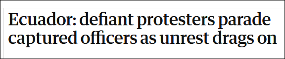 沒有總統(tǒng)的基多,更是陷入一片混亂。綜合《衛(wèi)報》、美聯(lián)社、路透社報道,當?shù)貢r間10日,土著示威者在基多街頭劫持了8名穿制服的警察,命令他們脫下身上所有裝備,之后將其推到示威基地的舞臺示眾,一邊嘲笑一邊高喊“莫雷諾,滾出去”。且在此期間,該基地內(nèi)的20多名記者曾一度被示威者拘留。