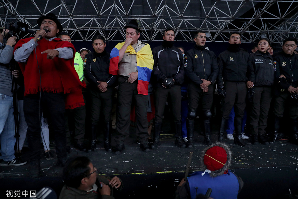 在厄瓜多爾首都基多,數(shù)千名土著示威者占領(lǐng)了一個文化劇院,并將其設(shè)為反對派基地。當?shù)貢r間10日,這些抗議者劫持了8名警察,沒收摩托車,命令他們脫下身上包括頭盔、防彈衣、靴子在內(nèi)的裝備,之后將他們推上舞臺示眾。警察們被迫抬著一具棺材,里邊裝著據(jù)稱是在抗議活動中遇害的一名土著示威者遺體。還有一名警察被迫將國旗披在肩上,頭戴一頂土著人戴的帽子。