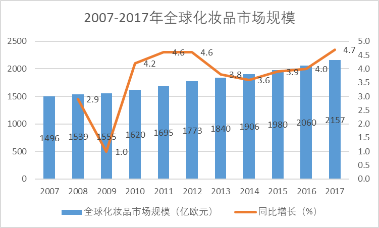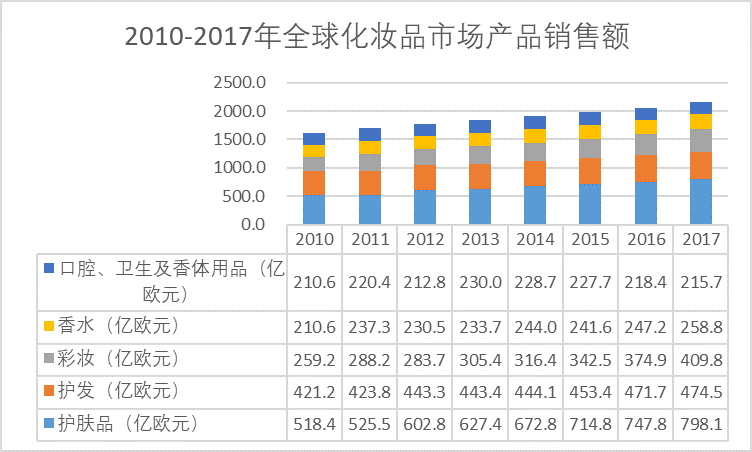 從產品品類看,化妝品行業(yè)中護膚品市場規(guī)模最大。2017年全球護膚品市場規(guī)模為798.1億歐元,占化妝品市場總量的37%;護發(fā)用品市場規(guī)模為474.5億歐元,占比為22%;彩妝市場規(guī)模為409.8億歐元,占比為19%;香水市場規(guī)模為258.8億歐元,占比為12%;口腔、衛(wèi)生及香體用品市場規(guī)模為215.7億歐元,占比為10%。